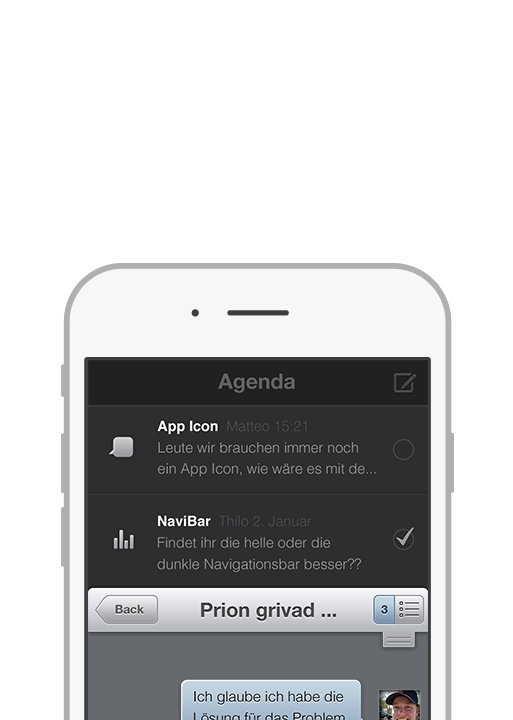 Durch antippen oder herunterziehen des Icons rechts oben, gelangt man zur Agenda. Diese zeigt eine Liste der wichtigsten Nachrichten, Listen und Umfragen. Die Agenda stellt sicher, dass wichtige Punkte nicht im Strom der Nachrichten verloren gehen. Durch antippen des Kreises der jeweiligen Punkte, kann man diese wie bei einer To-Do-Liste abhaken. Die Zahl neben dem Agenda-Icon wird dynamisch für alle Benutzer angepasst.