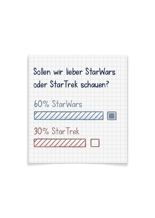 Eine Umfrage zu erstellen, funktioniert genau so, wie man es erwartet. Man stellt eine Frage und jedes Mitglied kann einmal abstimmen. Es ist eine unglaublich schnelle und einfache Möglichkeit Entscheidungen in der Gruppe zu treffen. Es wird sauber und übersichtlich dargestellt und man muss sich nicht durch hunderte Nachrichten kämpfen um zu einem Ergebnis zu kommen