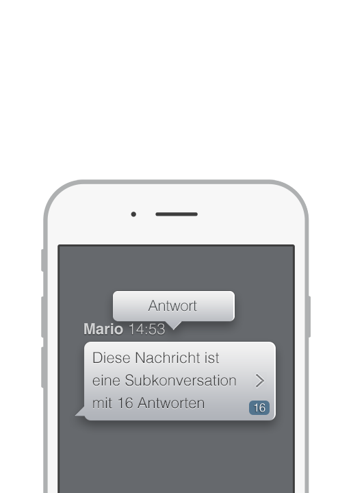 Mit Subkonversationen verliert man nie wieder den Überblick über die Unterhaltung. Dadurch das bestimmte Nachrichten kommentiert werden können, bleibt der Kontext erhalten auch wenn andere Gesprächsthemen dazwischen kommen. Durch Tippen auf eine Nachricht gelangt man in die Subkonversation mit allen Antworten und kann dort kommentieren. Die Anzahl der Antworten einer Nachricht ist im unteren linken Eck gekennzeichnet.